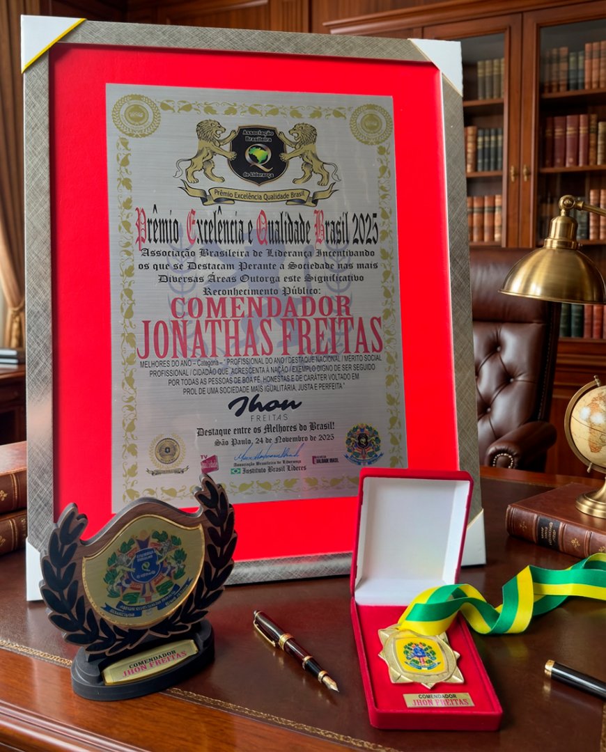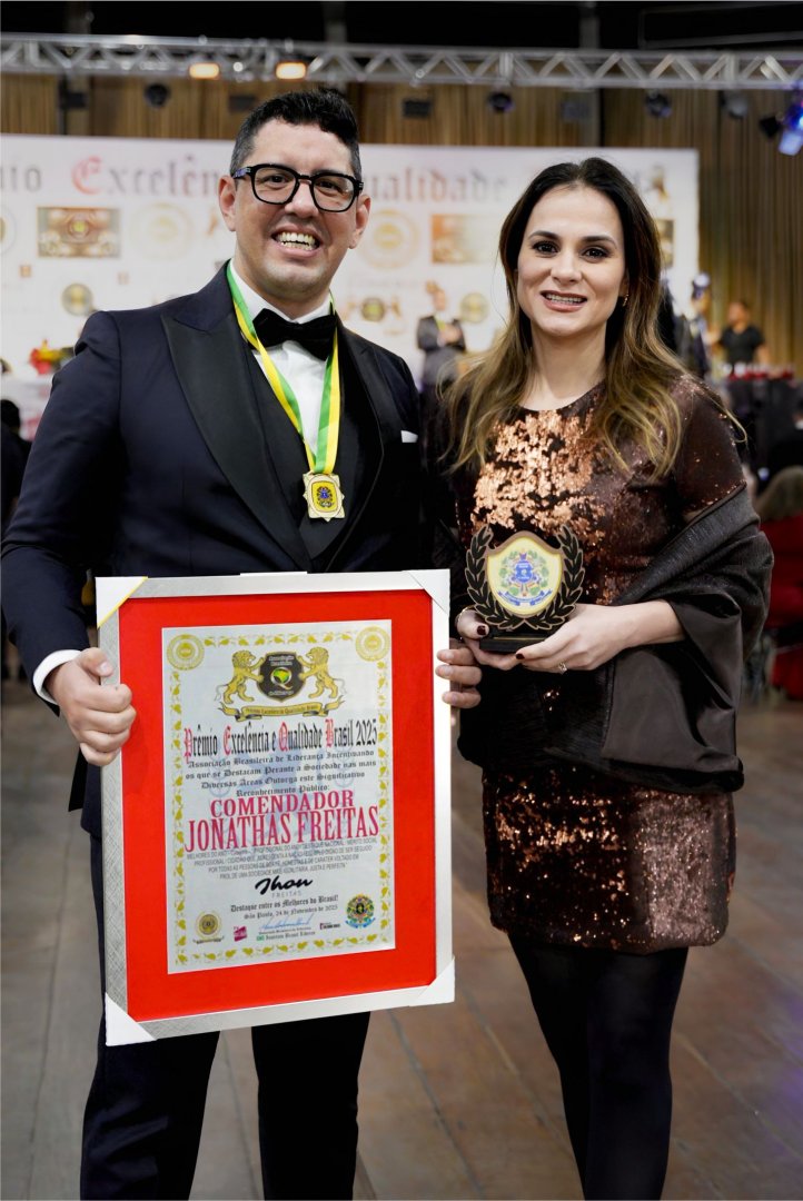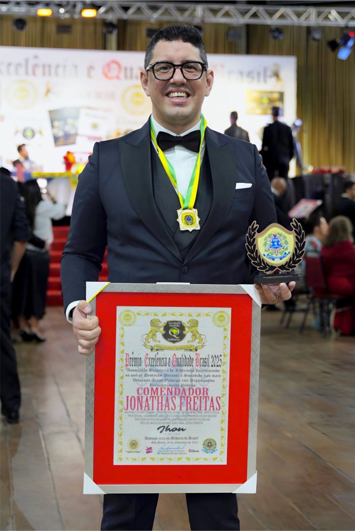 O empresário e investidor Jonathas Freitas foi agraciado com o título de Comendador, uma das honrarias concedidas pelo Prêmio Excelência e Qualidade Brasil, promovido pela Associação Brasileira de Liderança (Braslider). A distinção reconhece personalidades e profissionais que se destacam por sua contribuição ao desenvolvimento empresarial, social e institucional no país.