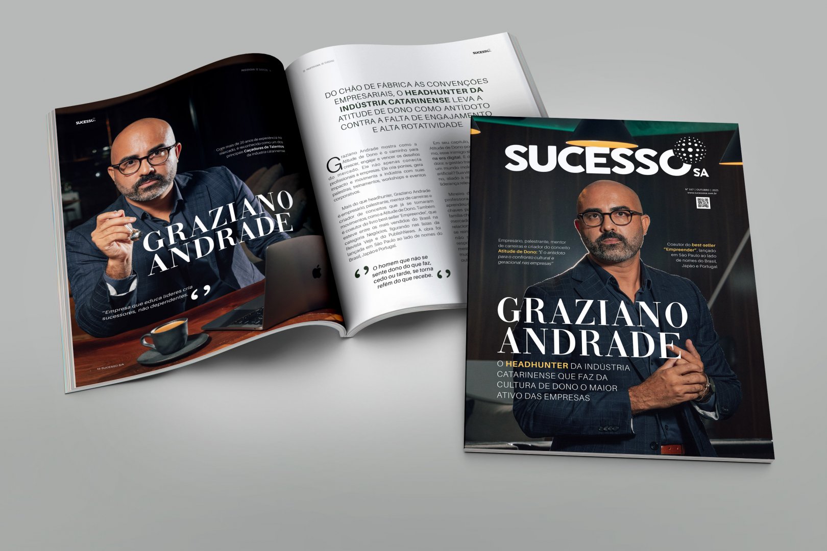 Mais do que headhunter, Graziano Andrade é empresário, palestrante, mentor de carreiras e criador de conceitos que já se tornaram movimentos, como a Atitude de Dono. Também é coautor do livro best-seller 'Empreender', que esteve entre os mais vendidos do Brasil na categoria Negócios, figurando nas listas da Revista Veja e do PublishNews. A obra foi lançada em São Paulo ao lado de nomes do Brasil, Japão e Portugal.